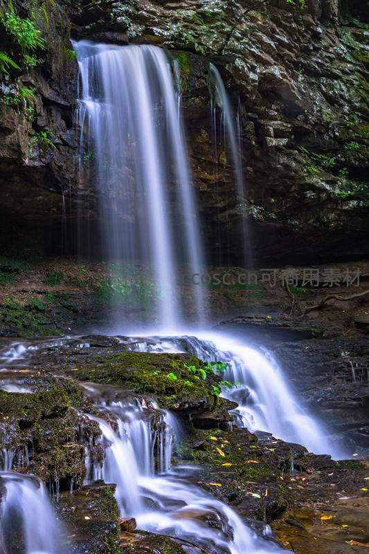 长曝光镜头捕捉瀑布如丝绸般柔滑的水流,自布满青苔的岩壁飞流直下,水花四溅,周围植被葱郁,营造出静谧而富有生命力的山林秘境。
