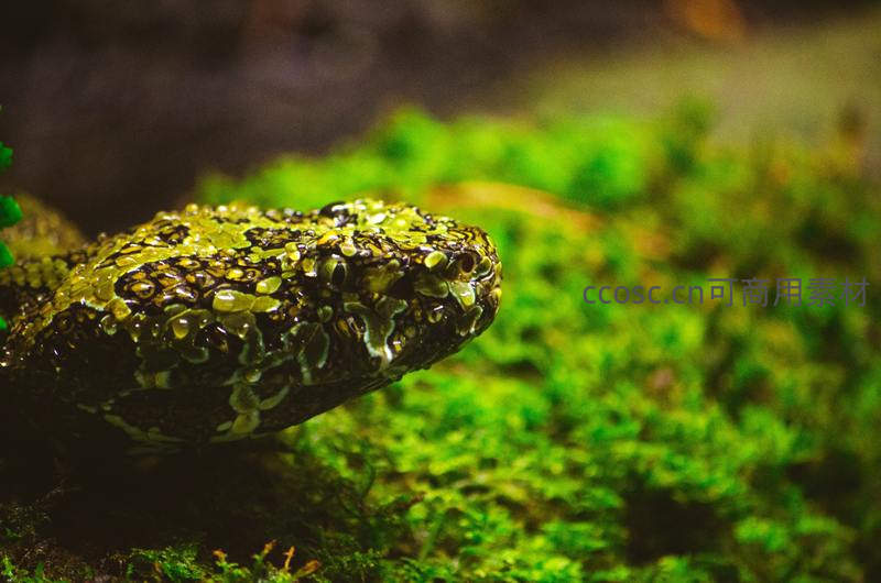 镜头聚焦于蛇类头部,其黄黑相间的鳞片在绿色苔藓背景中清晰可见,细节丰富,充满野性生命力。