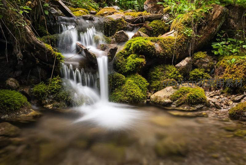 清澈的溪水形成数道小型瀑布,轻柔地流淌过长满鲜绿苔藓的圆润岩石,水雾氤氲,营造出如诗如画的森林秘境氛围。