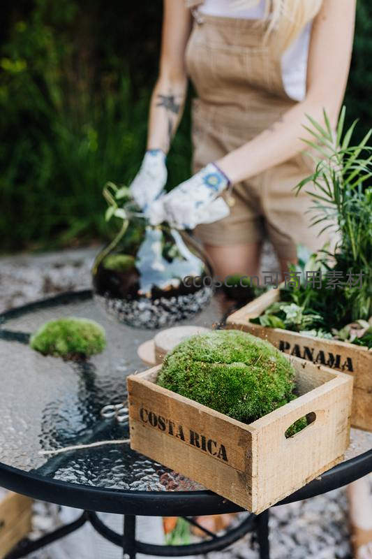 一位穿着工装裤的女士戴着园艺手套,在户外玻璃桌上精心制作苔藓生态瓶,身旁摆放着标有产地字样的木箱,充满生活情趣。