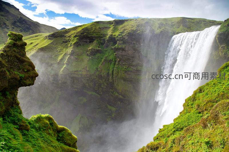 雄伟的瀑布从覆盖着浓密绿苔的悬崖峭壁上奔腾而下,激起漫天水雾,在阳光照耀下如仙境般壮丽,令人叹为观止。