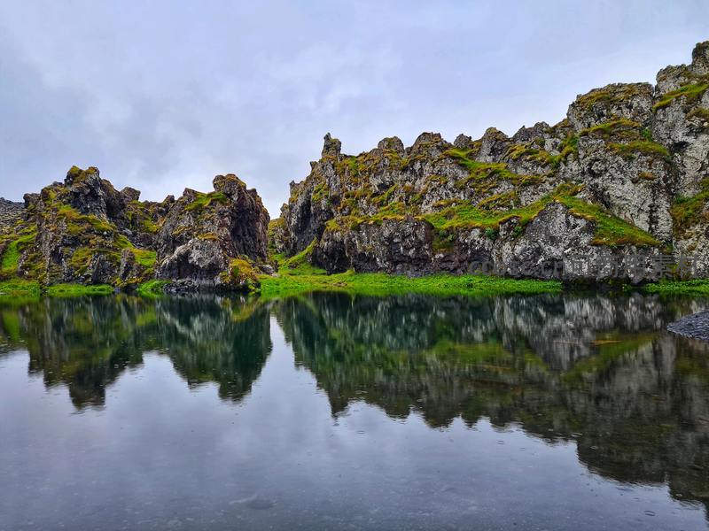平静的湖水如镜,完美倒映着岸边覆盖着绿苔的嶙峋玄武岩山体,灰蓝的天空与墨绿的山岩交相辉映,展现极致对称的自然之美。