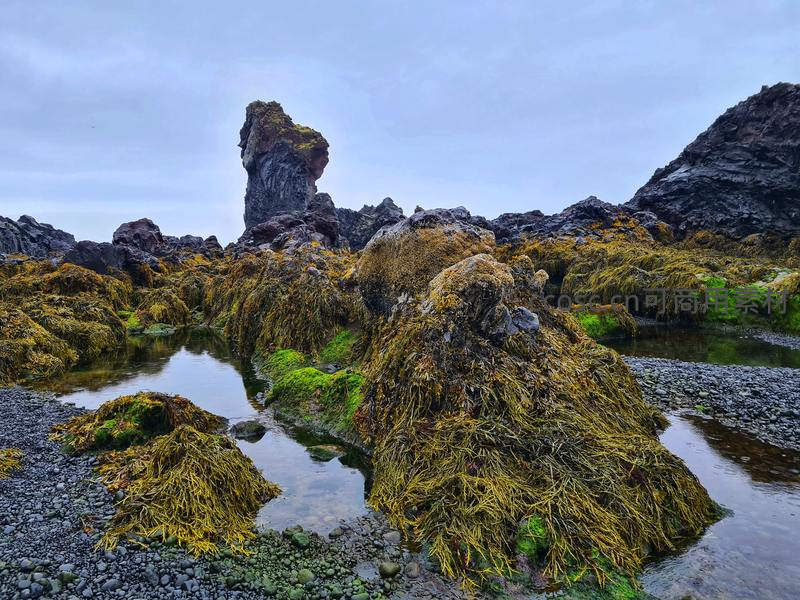 退潮后的黑色礁石滩上,巨大的岩石被金黄色的海藻缠绕覆盖,浅水洼中倒映着天空,展现出海岸潮间带独特的生态纹理。