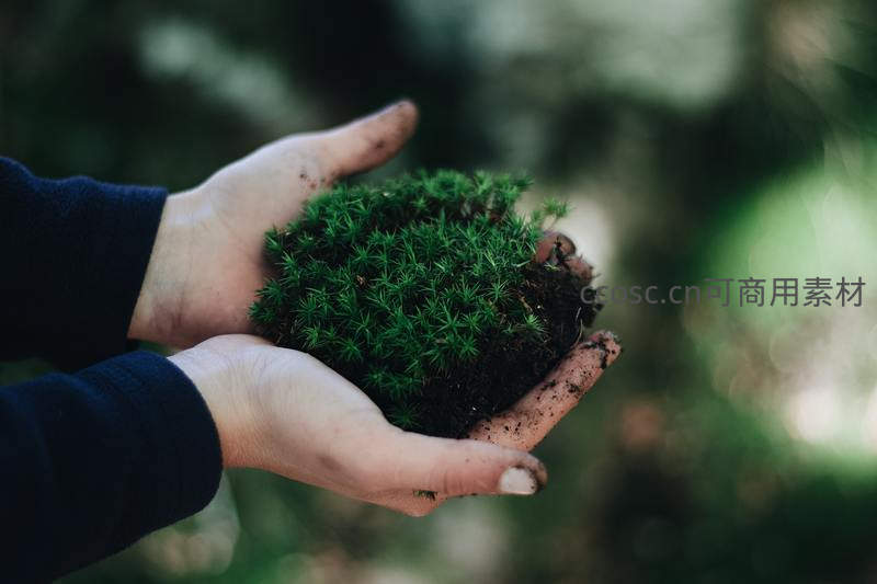 一双沾满泥土的手小心翼翼地捧着一团鲜活的绿色苔藓,象征着对微小生命的珍视与守护,传递出人与自然和谐共生的理念。