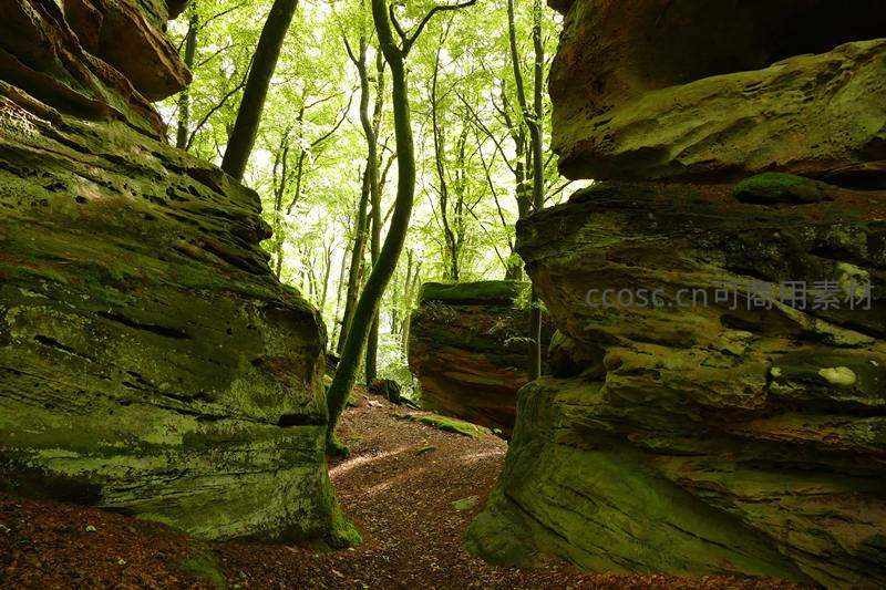 高耸的岩壁夹峙着一条林间小径,阳光穿透树冠洒下斑驳光点,苔藓覆盖的巨石与挺拔的树木共同构成一幅原始而静谧的自然画卷。