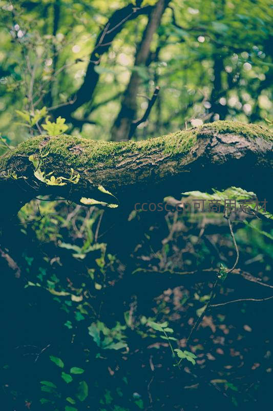 粗壮树干横卧林间,表面布满厚实青苔,周围嫩绿叶片随风轻摇,背景虚化突出主体,阳光透过枝叶洒下斑驳光影,尽显森林生机与静谧。