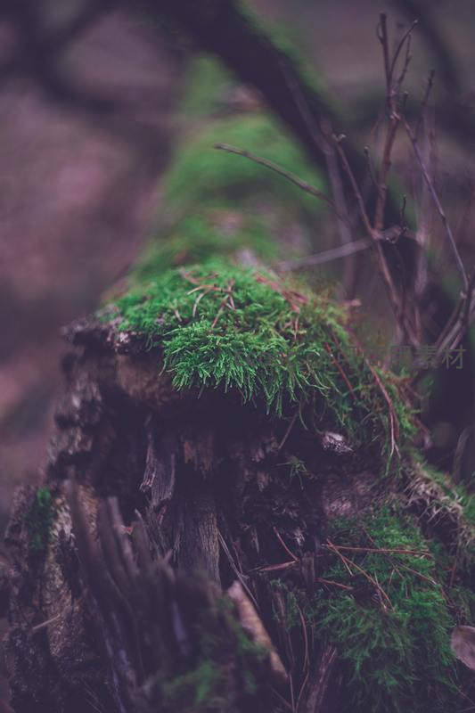 枯木桩上翠绿苔藓的微观世界