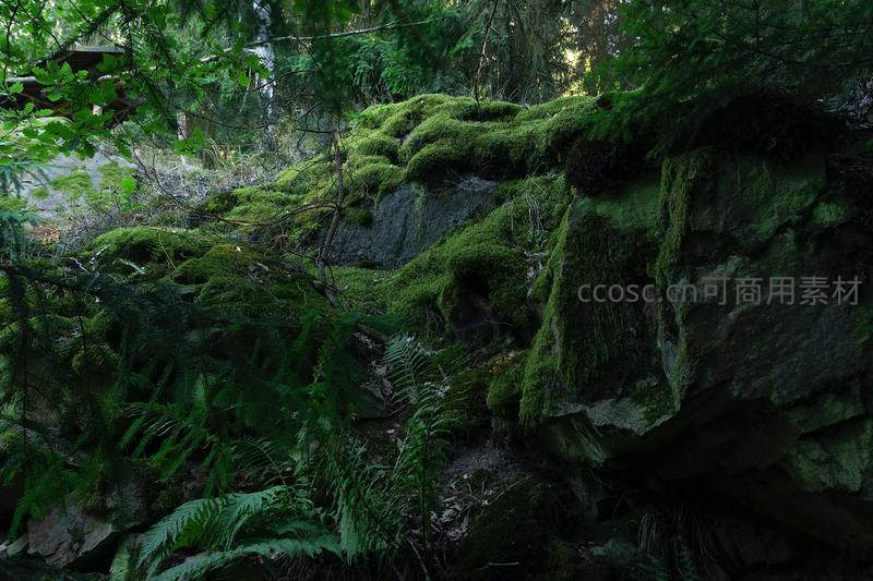 森林深处苔藓覆盖的岩石,蕨类植物环绕幽静