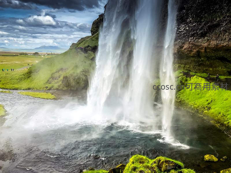 高耸的瀑布从陡峭岩壁奔流直下,激起漫天水雾,周围覆盖着鲜绿苔藓与草地,远处可见游客身影,构成一幅震撼人心的自然画卷。