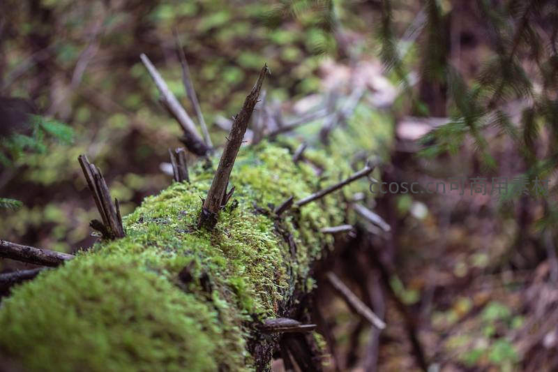 近距离捕捉一根倒伏在林间的枯枝,其表面被浓密的翠绿苔藓完全覆盖,细小枝杈刺出,展现了自然界中微小生命的顽强与细腻之美。