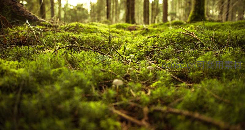 清晨或傍晚的阳光斜射进森林,温柔地照亮了铺满厚实青苔的地面,几朵小蘑菇悄然生长其间,营造出温暖、静谧的童话氛围。