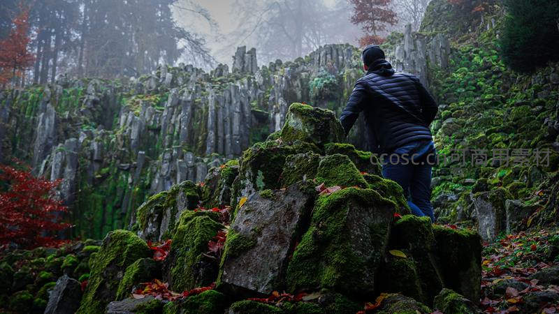 一名游客背对镜头,在雾气缭绕、布满青苔的奇特柱状岩石间攀爬探索,红叶点缀其间,宛如步入奇幻秘境,充满冒险与诗意气息。