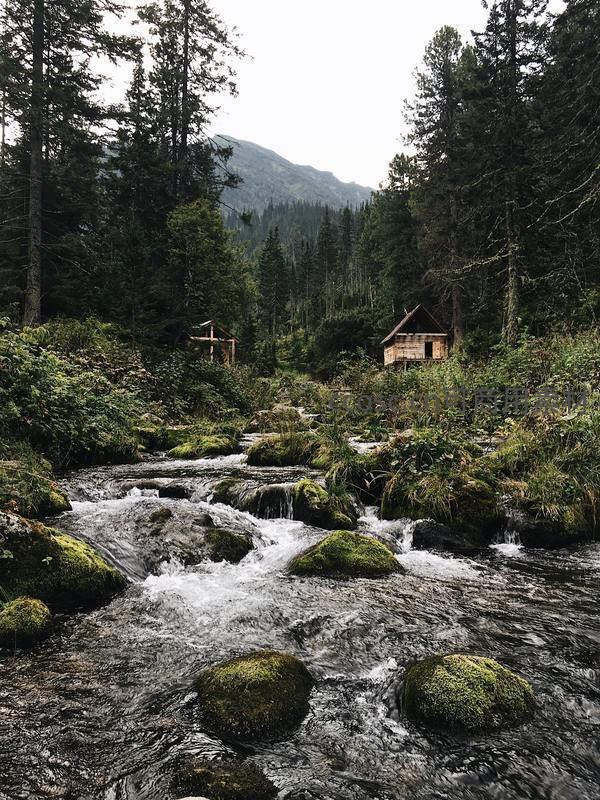 清冽溪水在覆盖青苔的圆润石块间流淌,远处松林掩映着一座原木小屋,背景是连绵青山,营造宁静避世的田园诗般度假氛围。