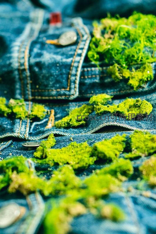 细腻的青苔生长在蓝色牛仔布上,形成自然与人工材质的奇妙对比,展现生命顽强与生态美学。