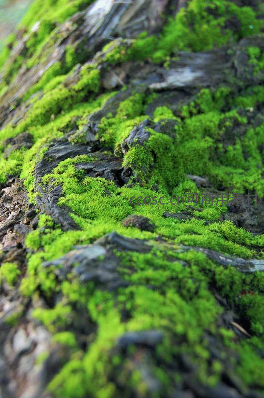 湿润树皮上覆盖着浓密鲜绿的青苔,细节清晰可见,传递出原始森林的静谧与生命力。