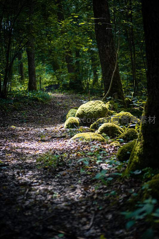 林间小径被斑驳阳光照亮,两旁岩石覆盖柔软苔藓,营造出静谧、清新的户外探险氛围。