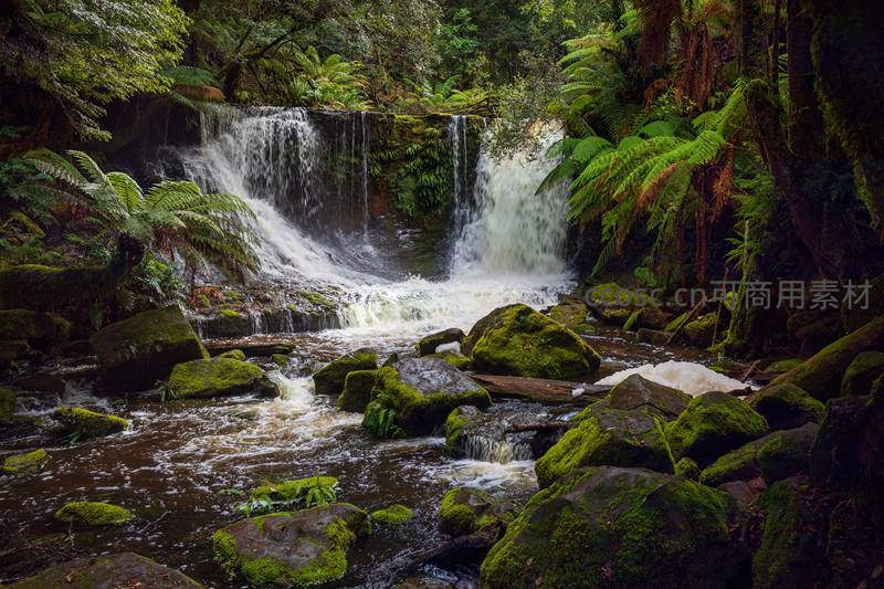 清澈的瀑布从林间倾泻而下,周围布满青翠苔藓和湿滑岩石,水花四溅,营造出宁静又充满生机的原始森林景象。