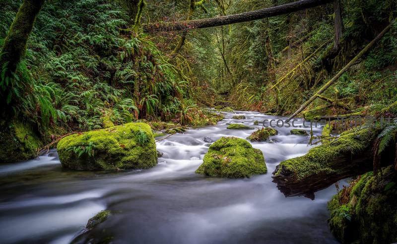 在茂密的雨林深处,清澈的溪水缓缓流淌过布满青苔的巨石,长曝光技术使水流如丝绸般柔滑,营造出超凡脱俗的静谧氛围。
