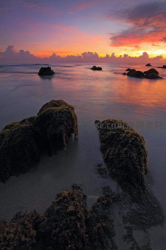 绚烂的日落将天空染成橙红与紫蓝渐变,平静海面倒映着天光,几块覆满海藻的礁石静静伫立,宛如被金色熔岩温柔包裹的自然雕塑。