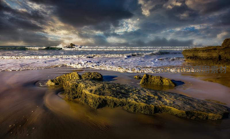 夕阳西下,海浪轻柔拍打着布满青苔的礁石,湿润的沙滩倒映着翻滚的云层与金色余晖,构成一幅宁静壮阔的海岸黄昏画卷。