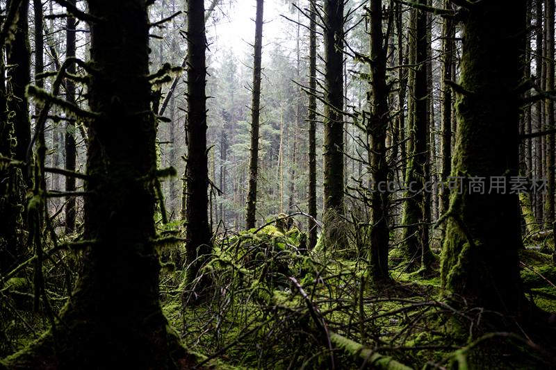 雾气弥漫的苔藓森林,树影婆娑