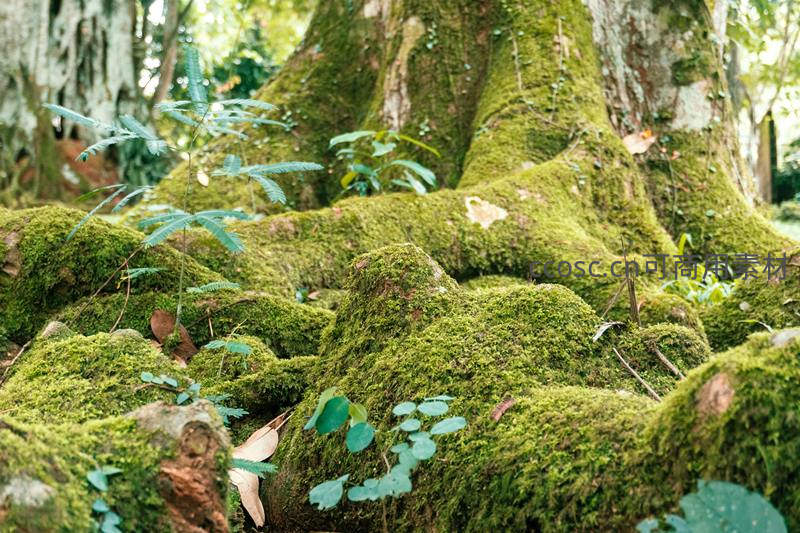 粗壮古树的根部被厚实柔软的青苔完全包裹,宛如铺开的绿色地毯,阳光透过林间洒下斑驳光影,充满生机与静谧。