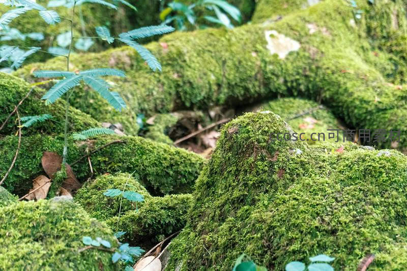 在潮湿的热带雨林里,大小不一的岩石被浓密的青苔层层覆盖,点缀着细小的蕨类植物,营造出原始而神秘的自然氛围。