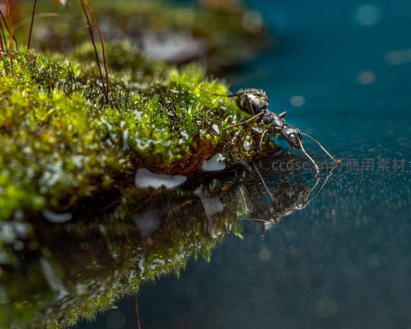 一只蚂蚁小心翼翼地靠近水边,苔藓上挂着晶莹的露珠,水面倒影清晰,微距镜头捕捉到这充满生机与诗意的自然瞬间。