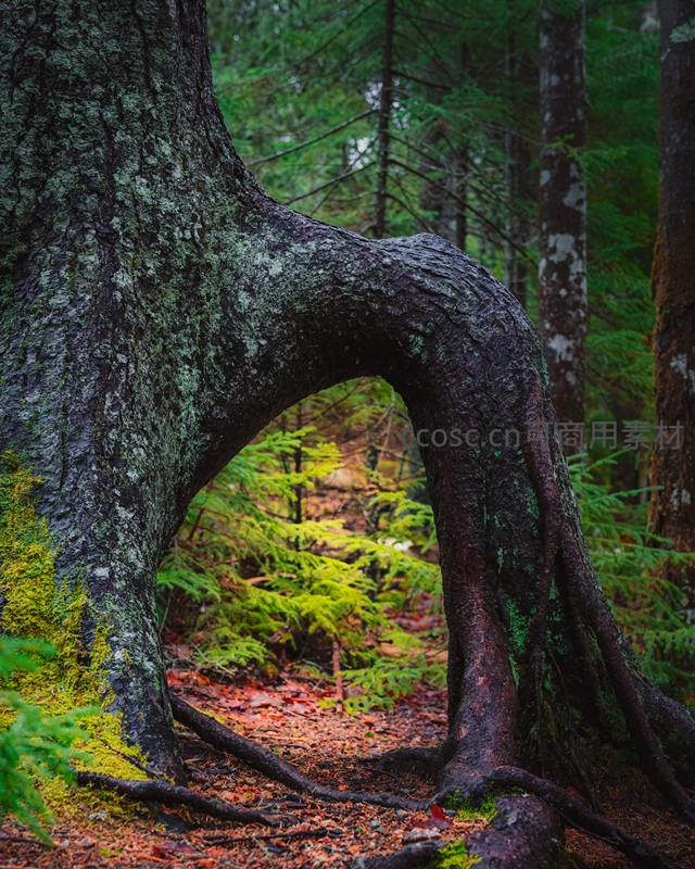 一棵大树的根部天然形成一道拱门,透过它可以看到林间小径和远处的绿植,阳光洒落,营造出神秘而原始的森林氛围。