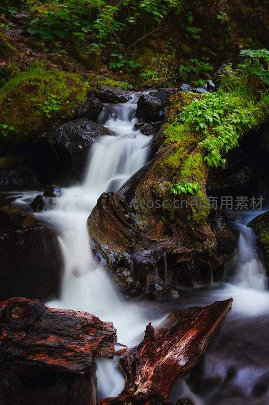 山涧中瀑布自岩石间奔流而下,周围植被繁茂,青苔点缀,形成一幅动静结合、生机勃勃的自然画卷。