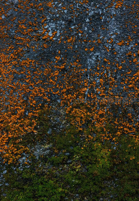 微距镜头下,深灰色岩石表面被鲜艳的橙色地衣和翠绿苔藓覆盖,形成强烈的色彩对比,展现了自然界的微观之美与生命力。