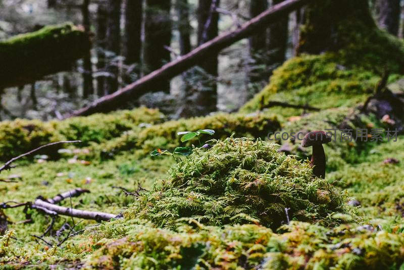 在茂密的森林地面,一簇鲜嫩的绿色苔藓上悄然生长着一朵棕色的小蘑菇,周围散落着枯枝落叶,展现了森林生态系统中静谧而奇妙的生命循环。