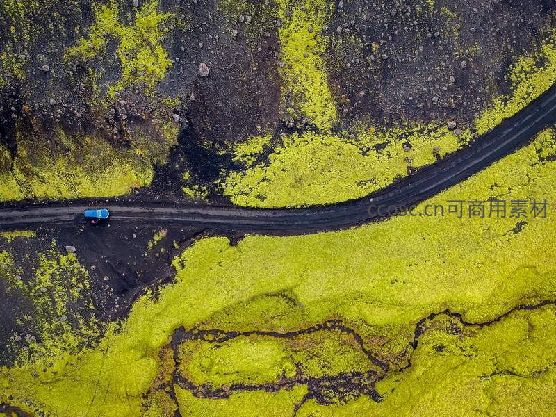 从高空俯瞰,一条黑色公路如丝带般蜿蜒穿过鲜亮黄绿苔藓覆盖的火山岩地,一辆小车点缀其间,展现人与自然的和谐探索。