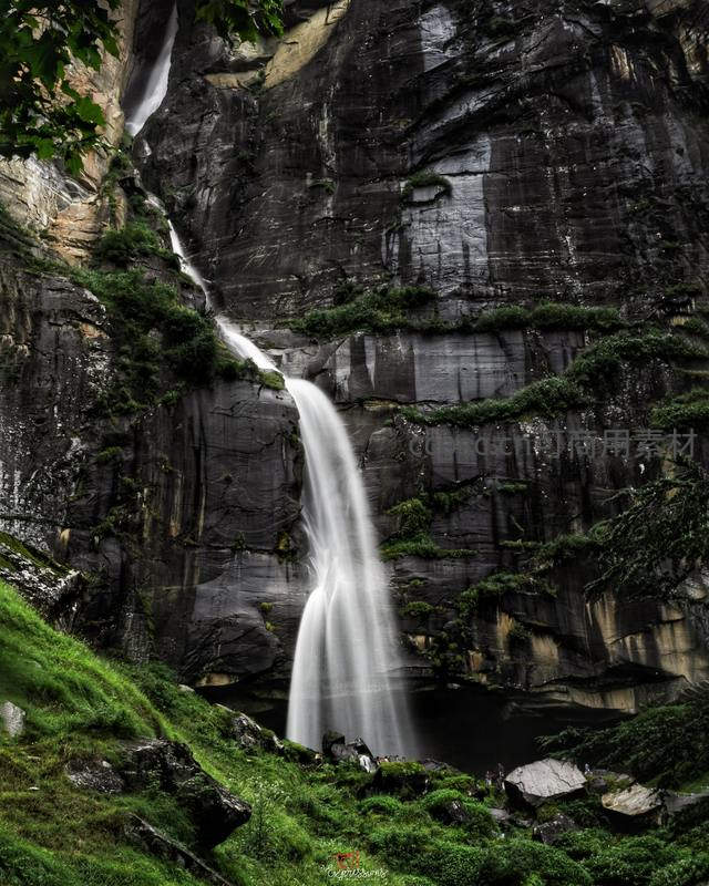 一道洁白的瀑布从高耸的黑色岩壁垂直落下,底部深潭幽静,周围绿草如茵,画面宁静而震撼,尽显自然雄奇之姿。