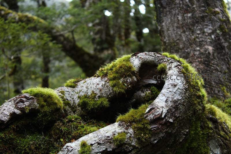 古老的树根蜿蜒盘旋,表面覆盖着翠绿青苔,展现出自然生命力的顽强与美感。背景是朦胧的森林,静谧而深邃。