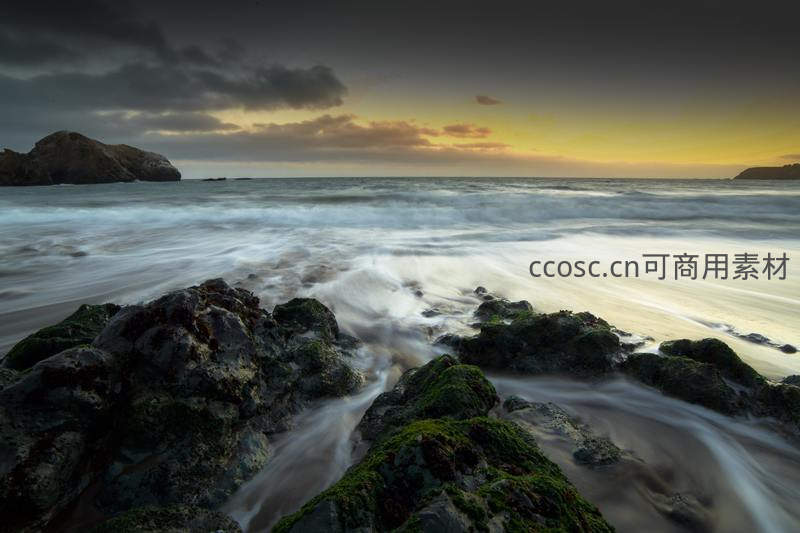 黄昏时分,海浪在长曝光下如丝绸般柔滑,轻抚着布满青苔的黑色礁石,远处山峦与彩霞相映,构成一幅宁静壮美的海岸画卷。