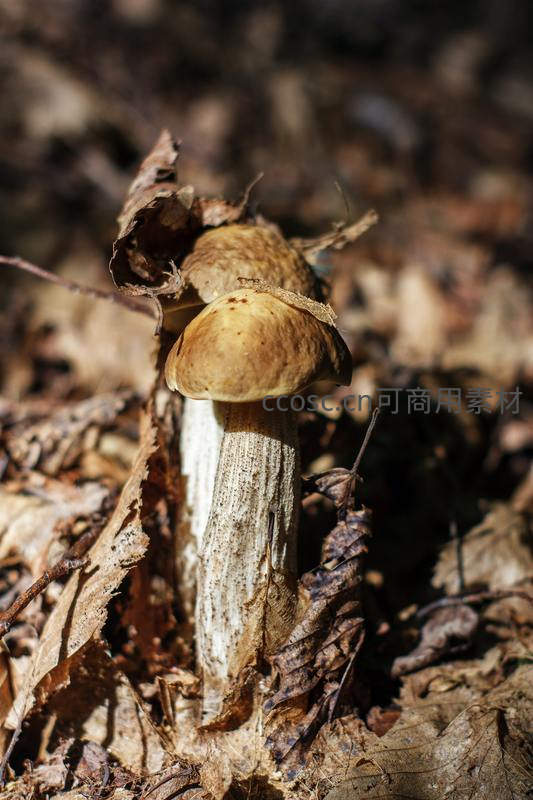 在枯黄落叶覆盖的林地上,一株饱满的牛肝菌傲然挺立,菌盖厚实,菌柄粗壮,阳光为其镀上金边,尽显秋季森林的静谧与丰盛。