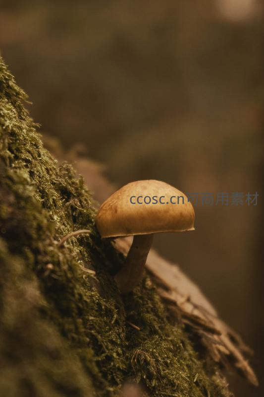 一颗圆润的褐色蘑菇从覆满青苔的老树干上悄然探出,暖色调光影温柔笼罩,诉说着森林深处静谧而古老的生态故事。