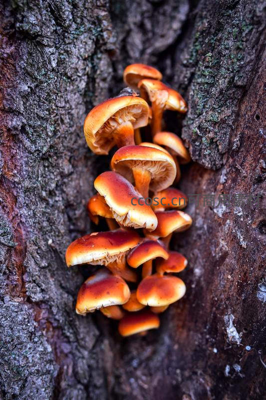 一簇鲜艳的橙色蘑菇紧密地从树干的裂缝中生长出来,菌盖饱满,与深褐色粗糙的树皮形成鲜明对比,充满生机。