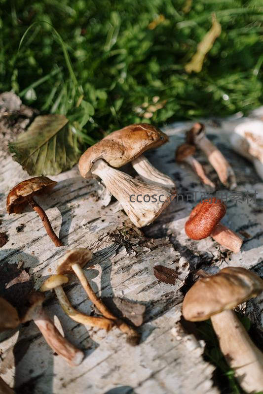 阳光洒在树桩上,几朵形态各异的野生蘑菇静静生长,背景绿意盎然,展现大自然的静谧与生机。