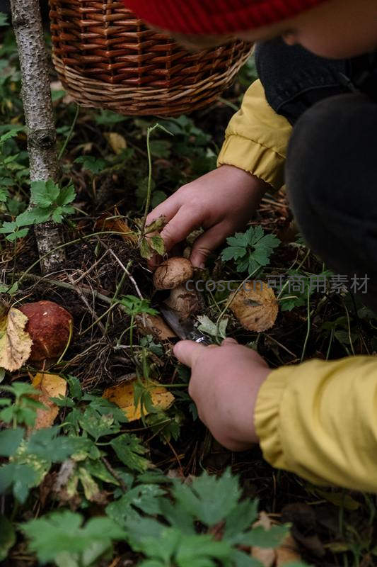 孩子蹲在林地,专注地用小刀采挖蘑菇,周围散落落叶与绿植,体现亲近自然、动手实践的童真乐趣。