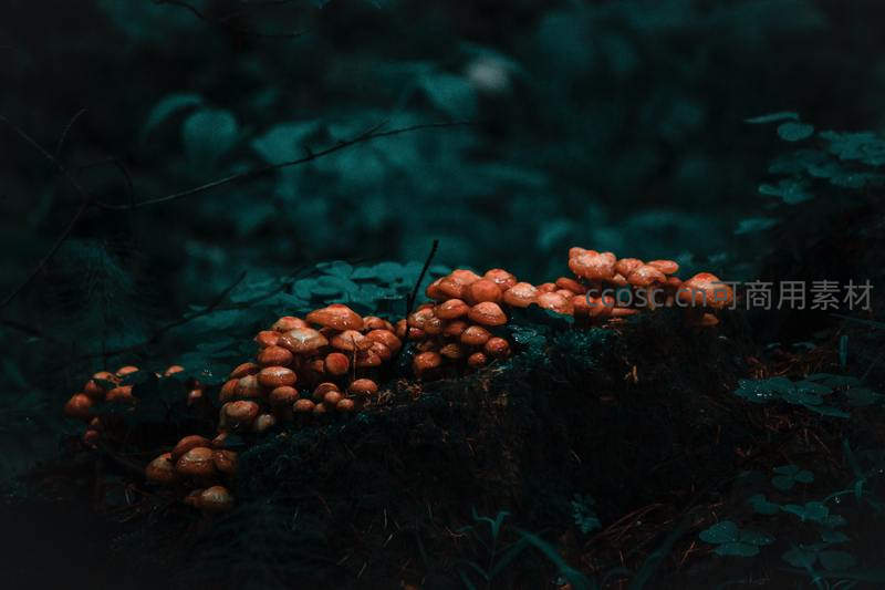 在幽暗潮湿的林地深处,一簇簇橙红色小蘑菇密集生长于腐木之上,散发微光般的暖色调,与冷蓝背景形成强烈视觉冲击。