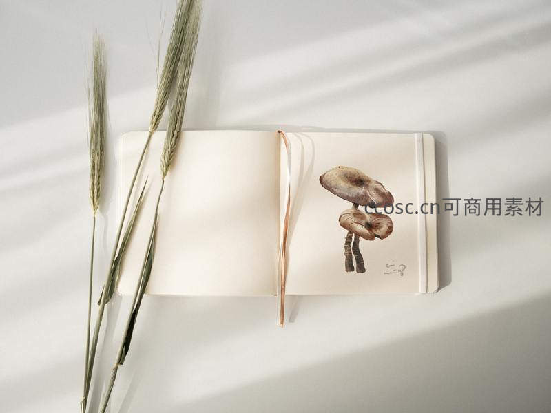 素描本上的蘑菇画作,搭配麦穗光影柔和