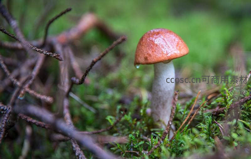 一颗棕红色的蘑菇顶着晶莹水珠,在绿色苔藓与枯枝间静静生长,展现了雨后森林里生机勃勃又宁静的微观世界。