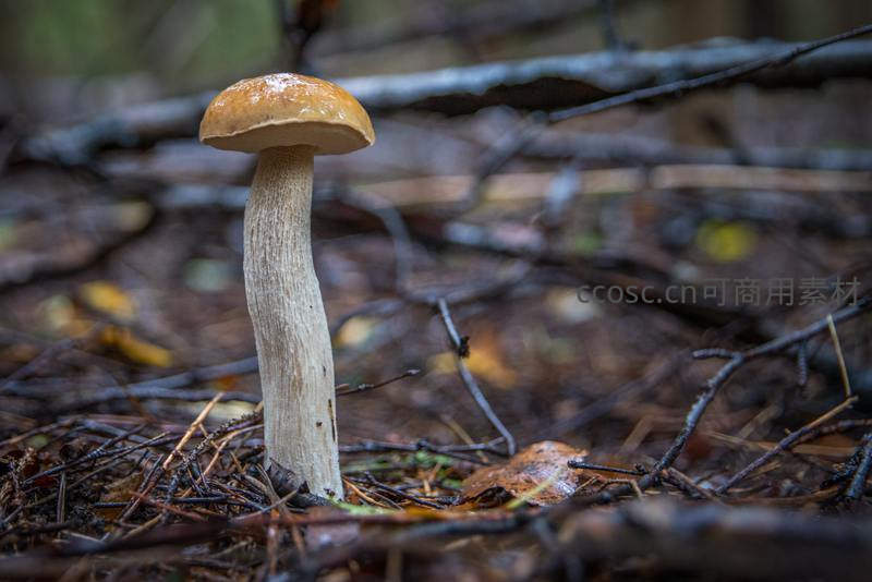 在散落着细小枯枝和落叶的林下,一株淡黄色菌盖、修长菌柄的野生蘑菇悄然生长,展现了森林底层的生命力。