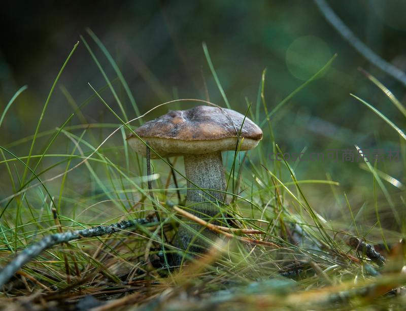 一株灰褐色蘑菇半藏于细长草叶之间,柔和的自然光勾勒其轮廓,营造出神秘而宁静的林下世界,体现微观生态的和谐与静美。