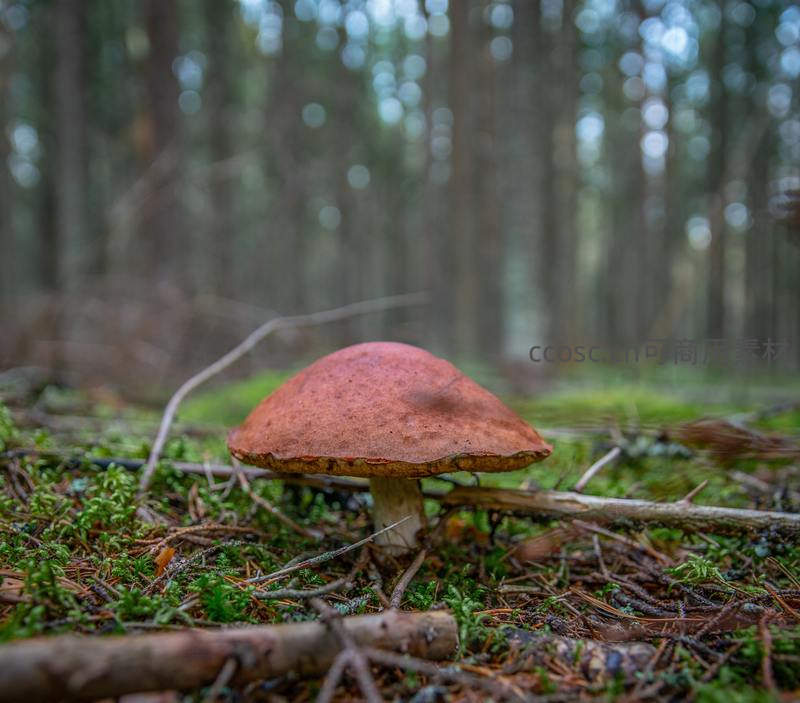 森林苔藓间静谧生长的棕色蘑菇