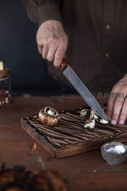 一双布满岁月痕迹的手正用锋利的厨刀将新鲜的蘑菇切成薄片,置于质朴的木砧板上,旁边是调味料,充满了温馨的居家烹饪气息。