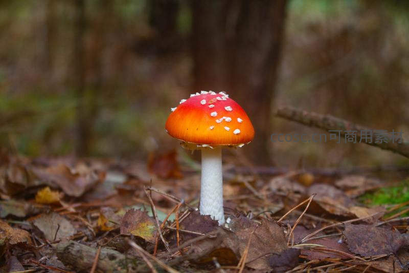 落叶林中孤傲红顶蘑菇