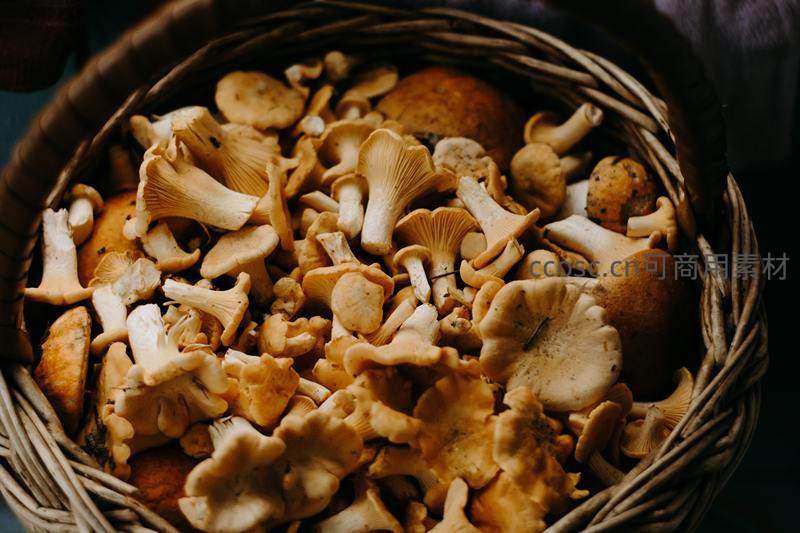 藤篮里盛满新鲜采摘的菌菇